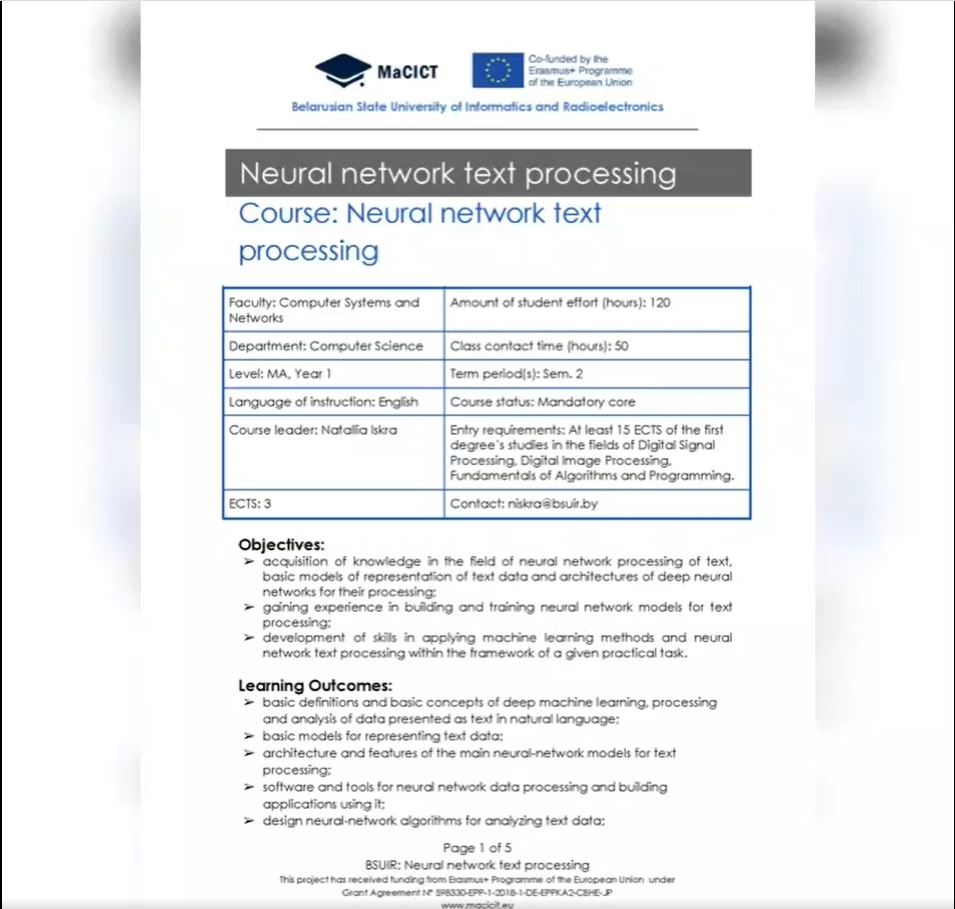 During studying the discipline Neural network text processing master students will know how to apply machine learning methods and neural network technologies for processing text presented in natural language.